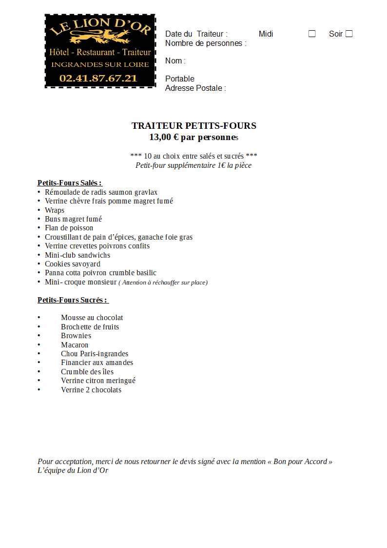 Service traiteur sur place et à emporter