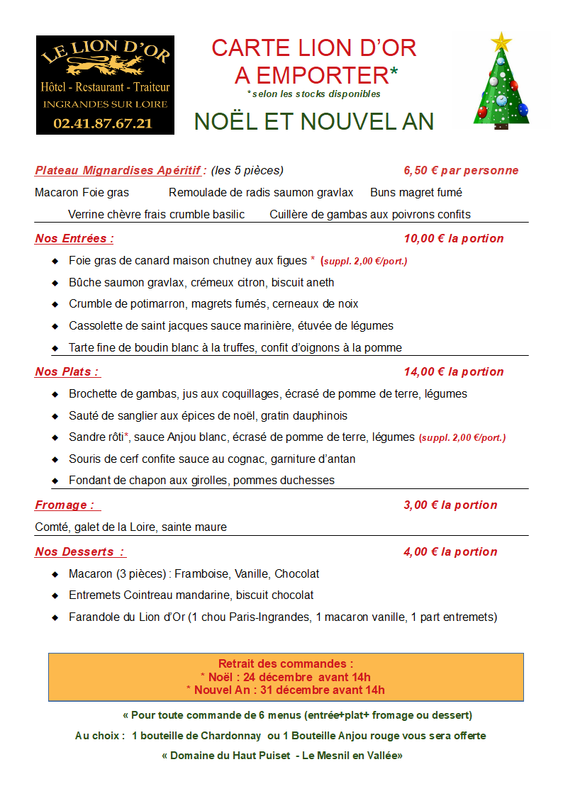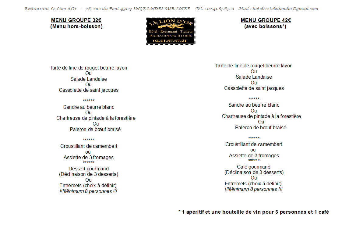 L'hôtel du Lion d'Or propose aux autocaristes en visite dans la région de s'attarder à Ingrandes, ville de caractère avec ses anciennes bâtisses et sa plage aménagée sur les rives de la Loire. Une restauration de qualité vous y attend, fruit du talent de notre chef soucieux d'élaborer une cuisine toujours plus inventive et savoureuse. Un menu personnalisé et adapté à vos impératifs vous est proposé dans le cadre de notre salle de restaurant d'une capacité d'accueil de 70 couverts.